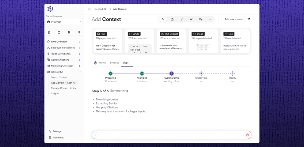 Traditional compliance systems operate across disconnected tools: communications surveillance, marketing review, supervision, testing. Teams are forced to manually stitch together a picture of risk. AI acts as a secondary filter, data stays siloed, and teams reconstruct context on their own.